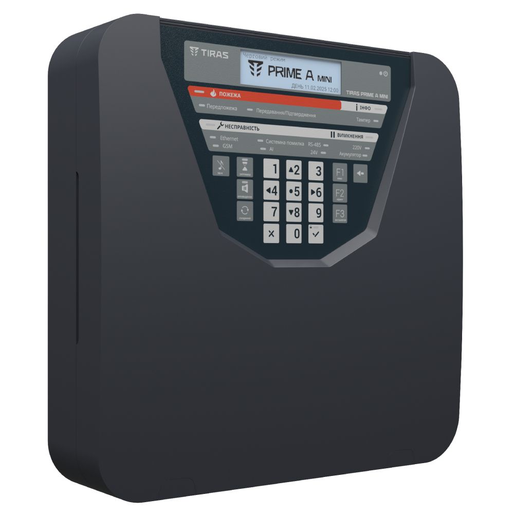Центральний пристрій адресної протипожежної системи Tiras PRIME A mini від українського виробника Tiras Technologies. Призначений для захисту невеликих та середніх об'єктів. Базові можливості: 1 адресний інтерфейс, 250 адресних пристроїв. Живлення: 220В, резервне живлення: акумуляторна батарея LiFePO4 або свинцево-кислотна на 7 А·год. Гарантія 36 місяців.