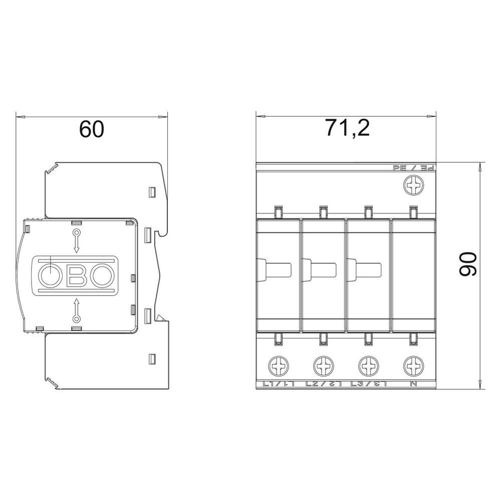 Пристрій захисту від імпульсних перенапруг (УЗІП, SPD), розрядник. Тип II (клас C) за EN 61643-11. Для захисту внутрішніх мереж від імпульсних перенапруг. Підходить для систем TN та TT. Конфігурація мережі: 3 фази + нейтраль/PE (3+NPE). Напруга: AC 230~280 В. Сумарний розрядний струм: 50 кА. Встановлення на DIN-рейку. Змінний верхній модуль. Універсальні клеми Multibase. Ступінь захисту: IP20. Відповідає стандарту EN 61643-11, перевірено VDE.