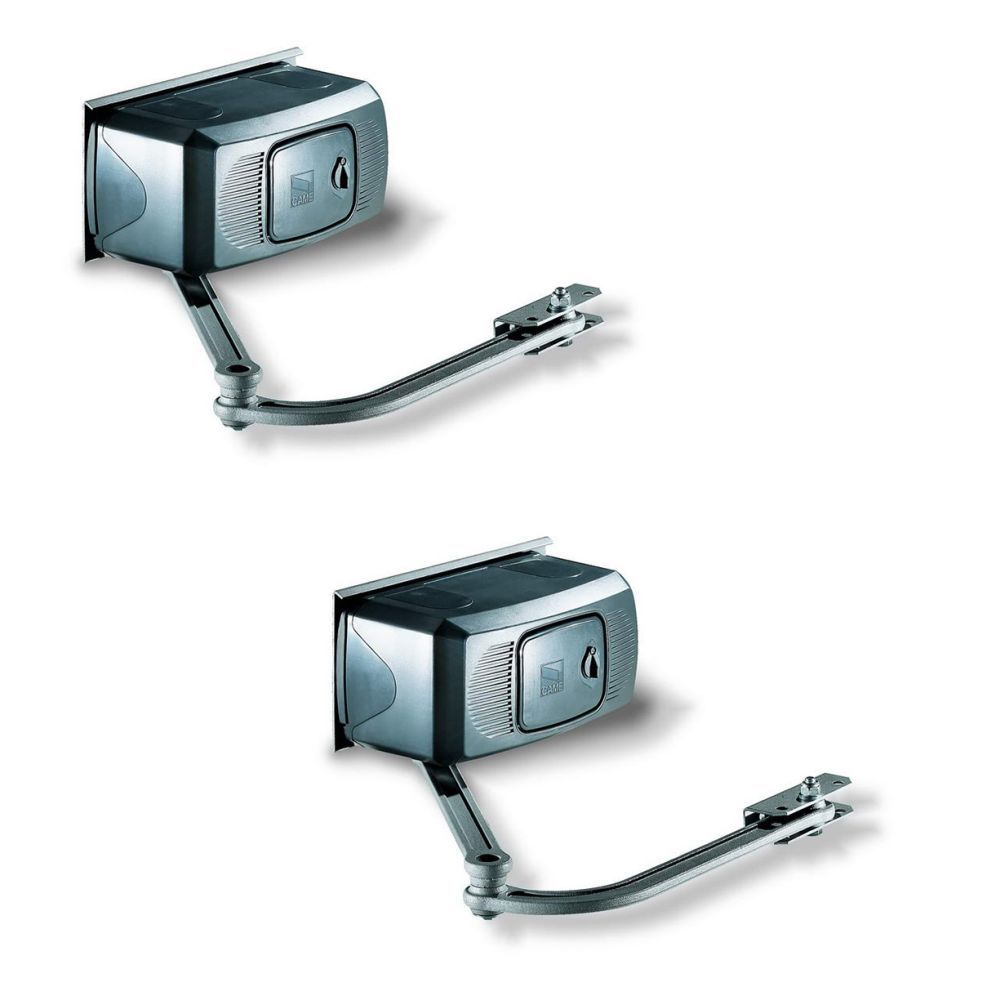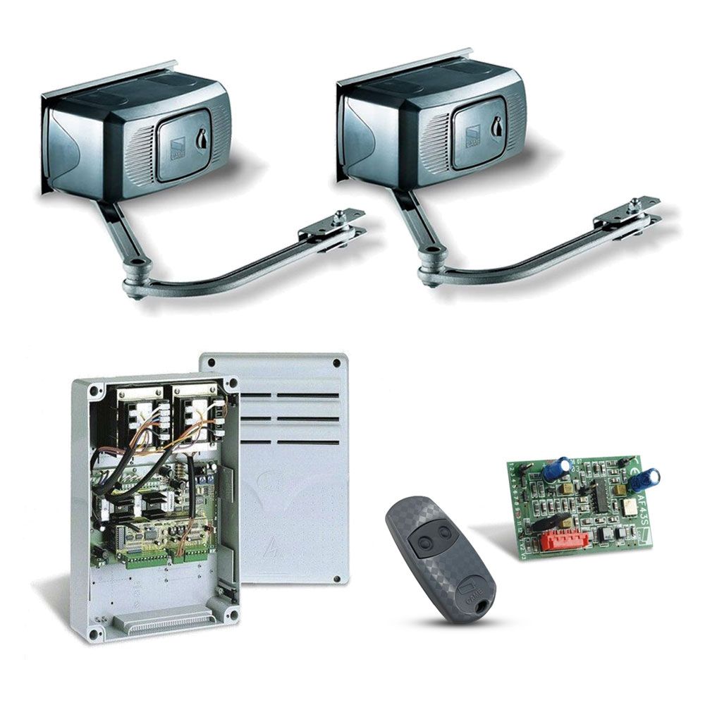 Комплект автоматики для розпашних воріт шириною до 3 м і вагою до 800 кг з можливістю встановлення на стовпи глибиною до 200 мм. До комплекту входять: телескопічні приводи, що самі блокуються, із кінцевими вимикачами – 2 шт., короб із панеллю керування – 1 шт., радіоприймач одноканальний 433 МГц – 1 шт., пульт ДК двоканальний – 1 шт. ІІнтенсивність використання 30%, обертальний момент 320Нм, час відчинення на 90° 18сек., потужність 150Вт, живлення 230В