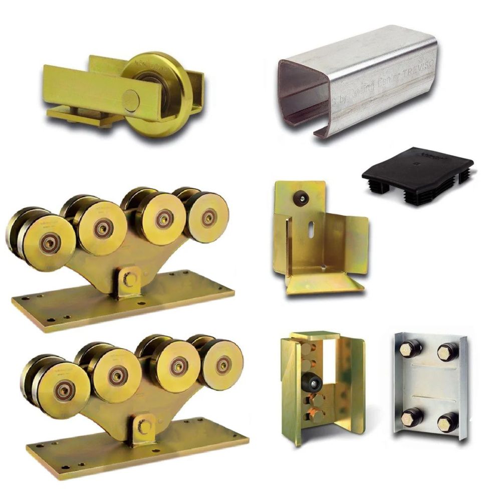 Комплект фурнітури для відкатних воріт вагою до 600 кг і шириною проїзду до 8 м. До комплекту входять: несучий профіль 6 м, 2 опорні роликові платформи, ролик кінцевий, уловлювач кінцевий, верхня пластина з роликами, верхній уловлювач, пластикова заглушка