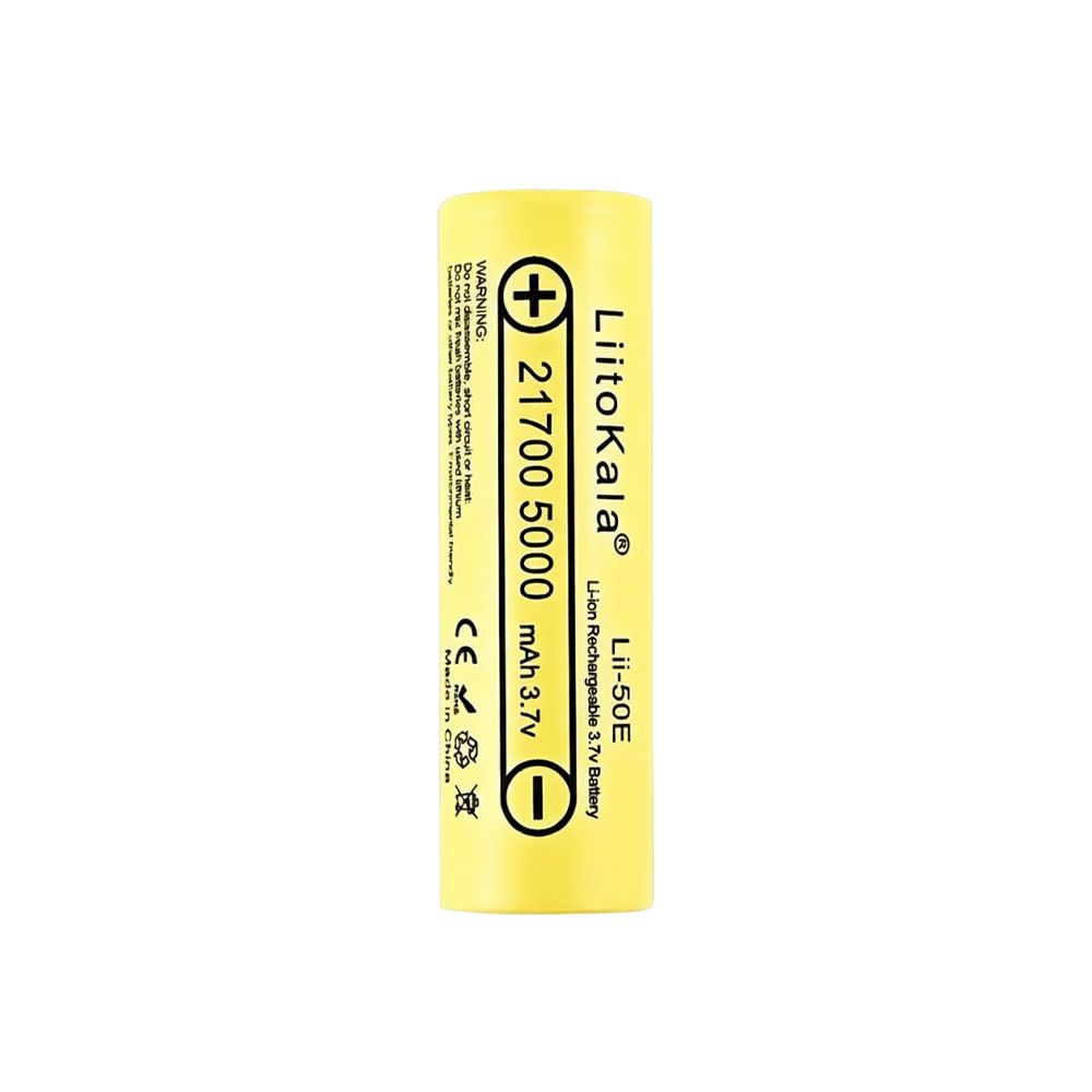 LiitoKala Lii-50E 5000mAh (21700) — літій-іонний акумулятор формату 21700 з ємністю 5000 мА·год і хімічним складом INR (NMC). Номінальна напруга становить 3,6 В, при заряді — 4,2 В, при розряді — 2,75 В. Максимальний струм розряду досягає 20 А короткочасно і 15 А при постійному навантаженні. Внутрішній опір близько 16 мОм, ресурс — до 500 циклів. Елемент має плоский контакт, без вбудованого захисту, розміри 21,5×71,5 мм і масу близько 66 г, що робить його оптимальним вибором для потужних збірок і електроінструменту.