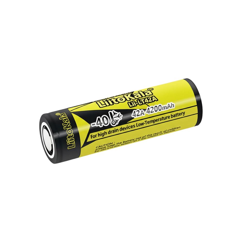 LiitoKala Lii-LT42A 4200mAh (21700) — високострумовий літій-іонний елемент формату 21700 з ємністю 4200 мА·год і номінальною напругою 3,6 В. Повний заряд досягається при 4,2 В, мінімальна напруга розряду — 2,75 В. Максимальний струм навантаження — 40 А короткочасно і 30 А постійно, внутрішній опір не вище 10 мОм. Підтримує до 1000 циклів перезарядки, не має вбудованого захисту і оснащений плоским контактом (Flat Top). Розмір 21,5×71,5 мм, вага близько 66 г, підходить для електровелосипедів, ліхтарів і збірок високої потужності.