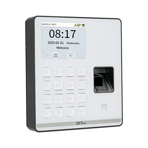 Аутентифікація: відбиток пальця / RFID-картка / пароль (фізична клавіатура). Пам'ять шаблонів відбитків пальця: 500. Пам'ять RFID карток (125 кГц): 500. Пам'ять користувачів: 500. Пам'ять журналу подій: 100 000. Макс. довжина пароля користувача: 6 цифр. Кольоровий 2.8" TFT дисплей. Зв'язок: Wi-Fi 2.4 ГГц. Інтеграція з хмарним ПО ZKBio Zlink. Живлення: DC 5 В 2 A. Робоча температура: 0 - 45°C. Розміри: 135.5 x 118.23 x 35.95 мм.