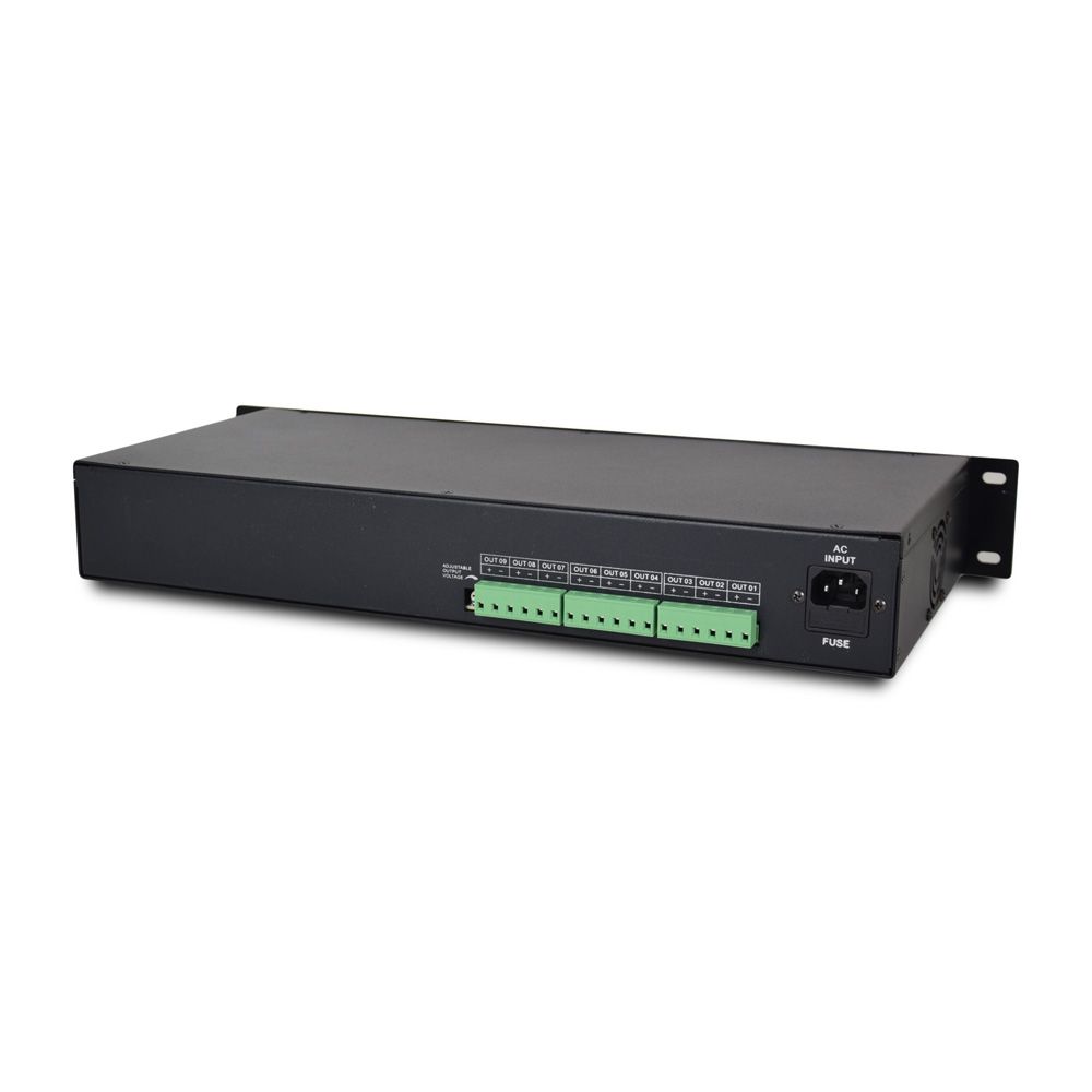 Розподільний блок живлення на 9 виходів. Вхідна напруга 190-240 В AC, 50/60 Гц, вихідна напруга DC 12-14 В/10А. Запобіжник (PTC), що самовідновлюється. Підходить під стійку 19". Габаритні розміри: 440 х 225 х 67 мм.