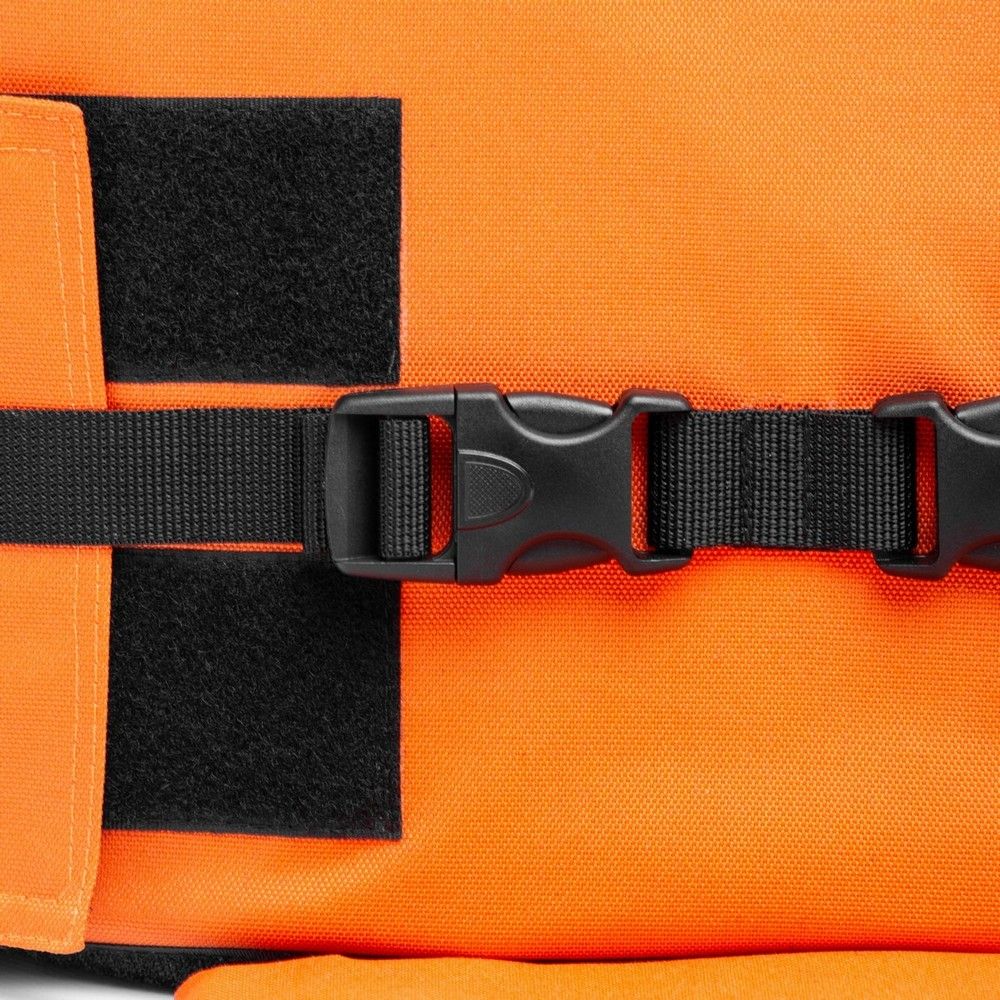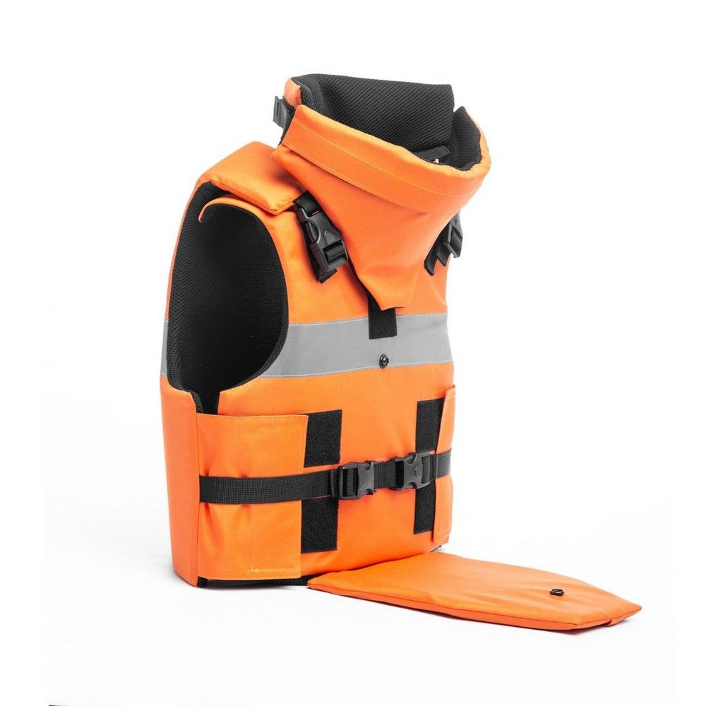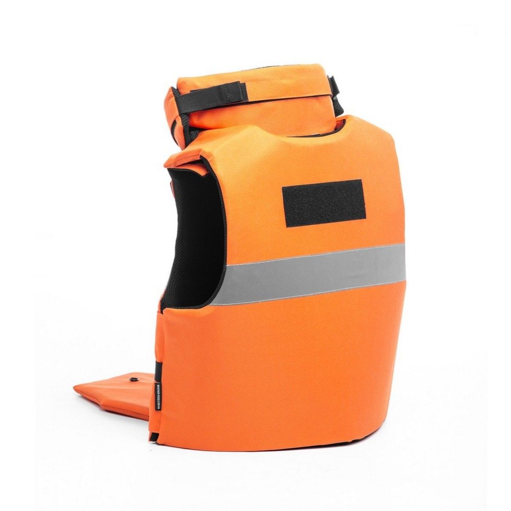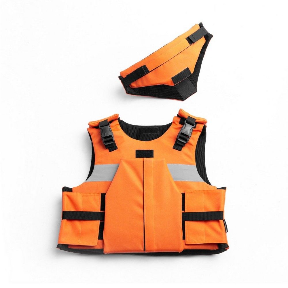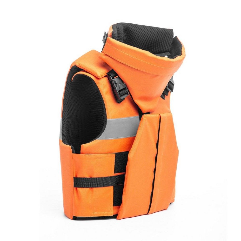 Дитячий захисний протиуламковий жилет. 1 клас захисту. Матеріал жилету: Oxford 600. Захисний шар: надвисокомолекулярний поліетилен (НВМПЕ). Товщина захисного елемента 11 мм. Колір помаранчевий. Місце захисту: плечі, спина, груди, живіт, боки. Площа захисту: 38 дм2. Розмір: М-L. Вага: 2.9 кг.