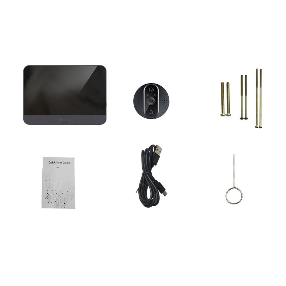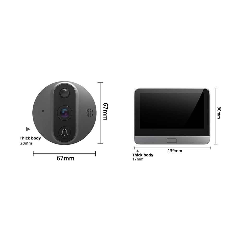 Комплект відеодзвінка (дверного вічка) з домофоном , працює через WiFi із застосунком TuyaSmart; відеокамера 2 Мп, кут огляду 166°; ІЧ-підсвічування; PIR-детектор руху; діагональ екрана домофона 4.3"; живлення від літієвої акумуляторної батареї ємністю 5000 мАг; запис на microSD-карту пам’яті до 64 Гб, купується окремо; розміри: відеодзвінок 67 / 67 / 20 мм, домофон 139 / 90 / 17 мм