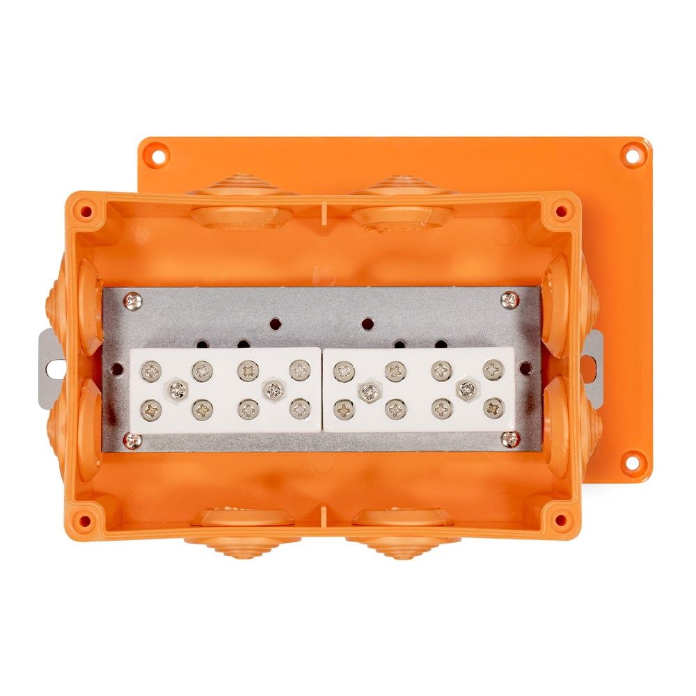 Вогнестійка розподільна коробка з класом вогнестійкості Е90; 8 керамічних клем діаметром 6 мм; напруга комутації 500 В, максимальний струм у лінії 30 А; 8 кабельних вводів; розміри 155 / 105 / 48 мм