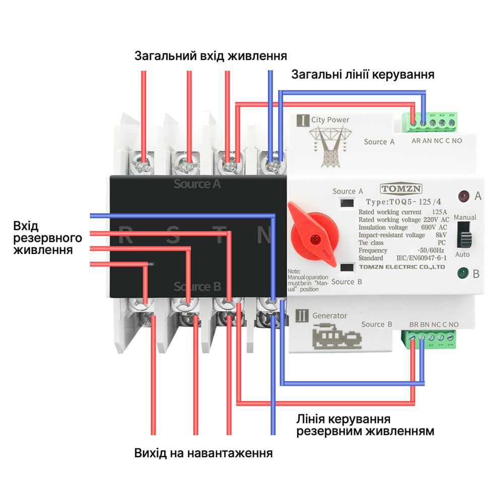 Автоматичний перемикач (АВР) під DIN-рейку TOMZN TOQ5/4P 125A 4 полюси