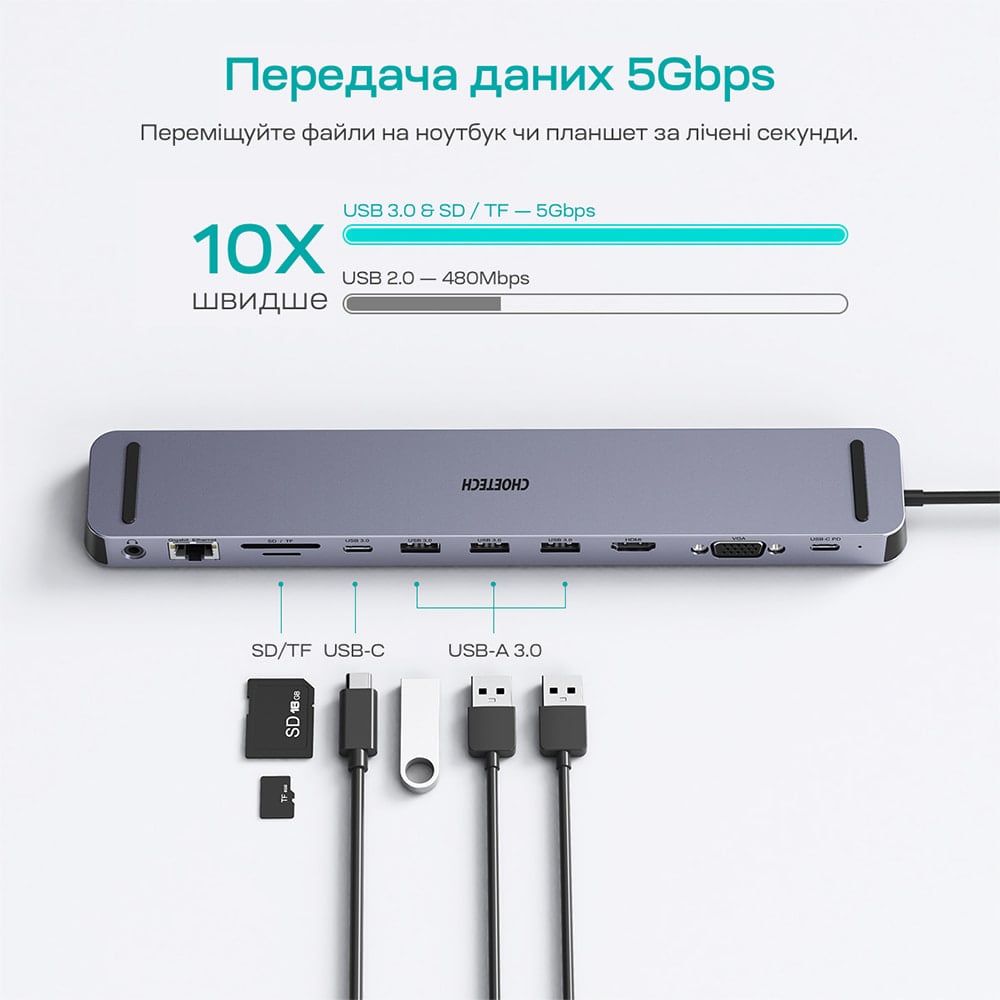 USB-C хаб 11-в-1 Choetech M20 HDMI 4K@30Hz, VGA, 3 USB-A 3.0, USB-C 3.0, RJ45, USB-C PD, SD-card, TF-card, 3.5mm audio
