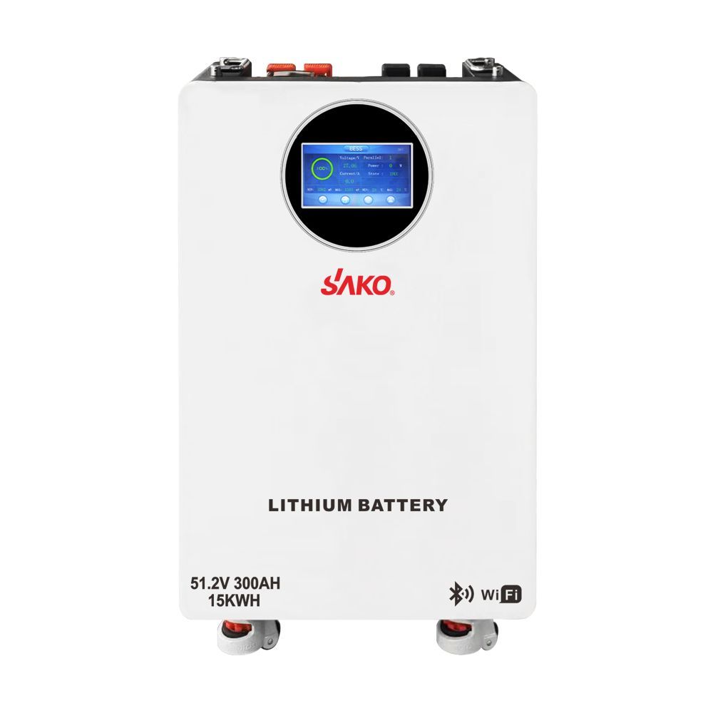 Літій-залізо-фосфатна акумуляторна батарея для системи накопичення енергії, встановлюється на стіну або підлогу; напруга 51.2 В; ємність 300 А·год / 15360 Вт·год; струм заряду / розряду 150 А / 200 А; ресурс: 8000 циклів заряджання-розряджання; комунікаційні порти CAN, RS485; WiFi/Bluetooth для моніторингу; LED-дисплей для відображення стану батареї; клас захисту IP20; в одну систему можна паралельно підключити до 15 акумуляторних батарей; тип клем M8; розміри 900 / 625 / 190 мм; вага 121 кг