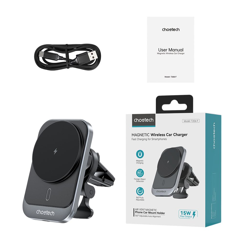Автомобільний зарядний пристрій Choetech T206-F Black бездротова зарядка, магнітне кріплення