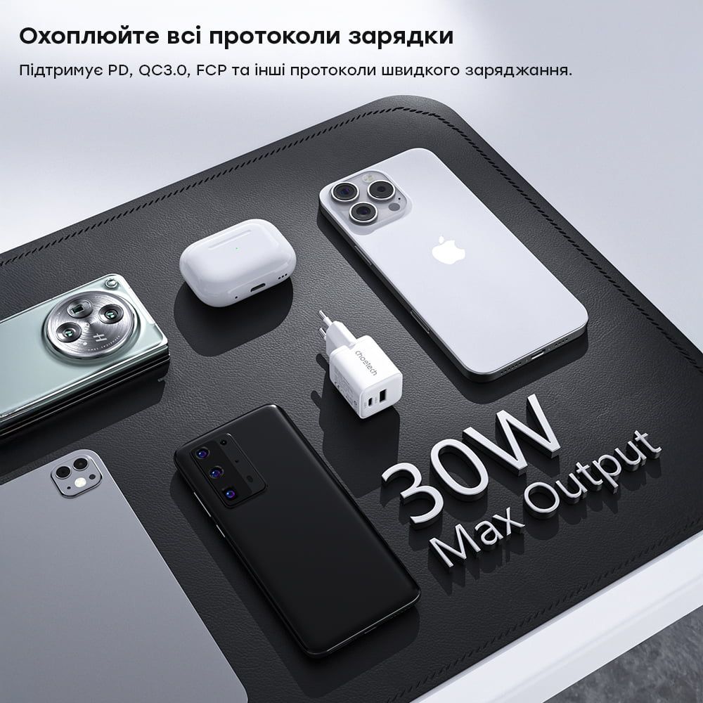 Мережевий зарядний пристрій (PD 30 Вт) з 2 USB-портами: USB-C та USB-A; вхідна напруга 100-240 В 50/60 Гц, 0.8 А макс; максимальна вихідна потужність 30 Вт; вихід 1 USB Type-C: 5В/3А, 9В/3А, 12В/2.5А, 15В/2А, 20В/1.5А (30 Вт макс.); вихід 2 USB Type-A: 5В/3А, 9В/2А, 12В/2.5А (18 Вт макс.); спільний вихід (USB Type-A + USB Type-C): 5В/3А; розміри 30.8 / 32.2 / 75 (з вилкою)