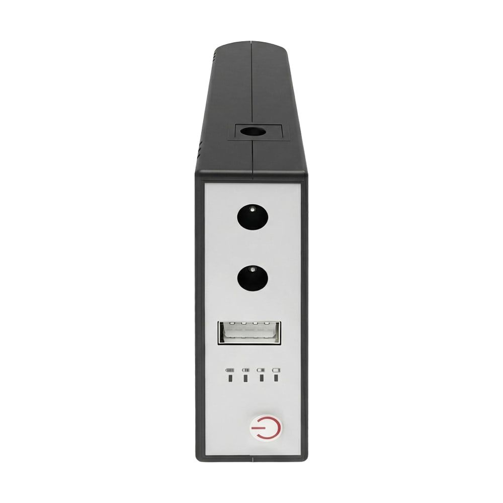 Джерело безперебійного живлення з 4 вбудованими акумуляторними батареями Li-ion ємністю 2600 мА·год (загальна ємність 10400 мА·год); максимальна загальна вихідна потужність 24 Вт; вихідні інтерфейси USB, DC *2, вихідна напруга 5 В + 9 В + 12 В; вихідна напруга/струм кожного виходу: USB: 5В/1А, DC1: 9В/1А, DC2: 12В/2А; вхідна напруга DC 12В/2А; роз’єм DC вхідний 5.5 / 2.1 мм, роз’єм DC вихідний 5.5 / 2.5 мм; розміри 132 / 79 / 28.5 мм, вага 380 г; у комплекті кабель DC-DC довжиною 51 см, розгалужувач живлення DC-2 DC довжиною 51 см і роз'єм DC. Блок живлення до комплекту не входить, рекомендуємо блок живлення 12В від 2А та більше