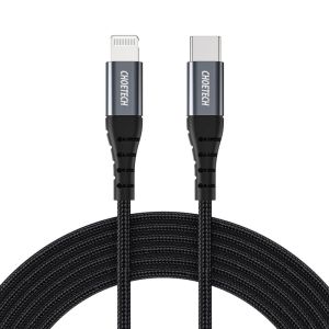 Кабель для заряджання та передачі даних з роз’ємами Type-C та Lightning; вихід 9 В/2 А (макс. потужність 18 Вт), 9 В/3 А (макс. потужність 27 Вт); швидкість передачі даних до 480 Мбіт/с, підтримка стандарту USB 2.0; сумісність з пристроями від Apple, сертифікація MFI; матеріал: нейлонове обплетення; довжина кабелю 2 м; вага 65 г