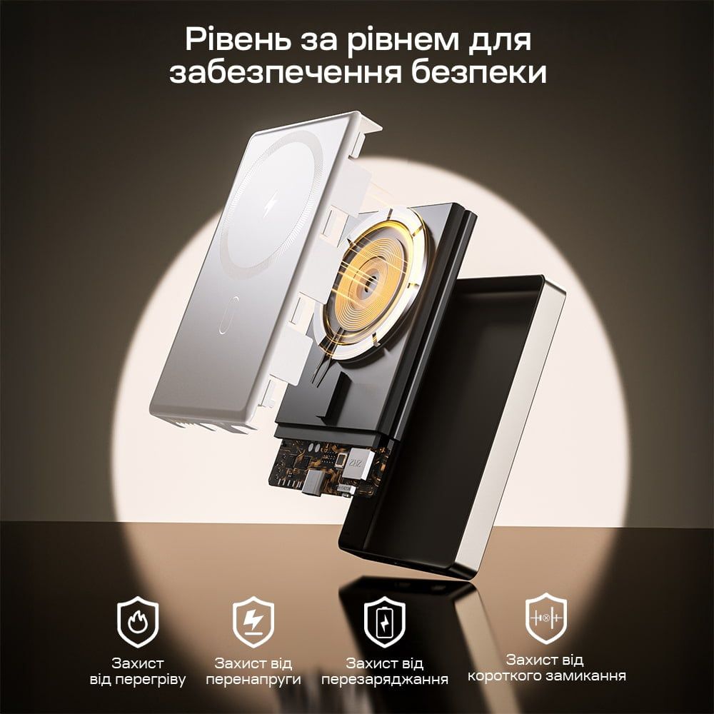 Повербанк з ємністю батареї 10000 мА·год, з бездротовою магнітною зарядкою; тип батареї: літій-полімерна (Li-pol); інтерфейси: вхід Type-C: 5V/2.4A, 9V/2A, 12V/1.5A (макс. 18 Вт), виходи: Type-C: 5V/3A, 9V/2.22A, 12V/1.67A (макс. 20 Вт); бездротова зарядка: 5V/1A, 5V/1.5A, 5V/2A, 5V/3A (макс. 15 Вт); LED-індикація; протоколи швидкого заряджання PD3.0 / QC3.0 / AFC / FCP / Apple2.4A; розміри 105 / 66 / 14.6 мм