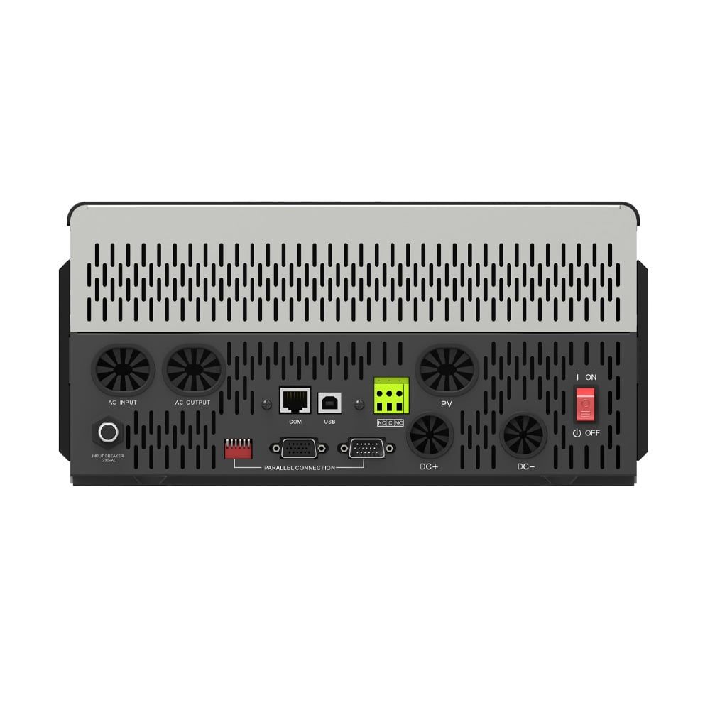 Автономний високочастотний однофазний інвертор; максимальна потужність 4 кВт, максимальна короткочасна потужність 8 кВт; правильна синусоїда на виході 220 В; вбудований MPPT-контролер та мережевий зарядний пристрій; максимальний струм заряду 100 А; вхідна напруга 90-280 В; діапазон напруги від сонячних панелей 150-450 В, макс. потужність 5000 Вт; ККД 92%; вихідна напруга 230 В ±5%; вихідна частота 50/60 Гц; напруга акумуляторної системи 24 В; час перемикання на АКБ 10 мс (режим ДБЖ); підтримка заряду АКБ типу AGM/GEL/LiFePo4/Li-ion; вбудований WiFi для віддаленого моніторингу; функція «холодного» пуску; режим підмішування; захист від глибокого розряду, перевантаження, короткого замикання; робоча температура 0°C~+50°C; розміри 322 / 486 / 134 мм
