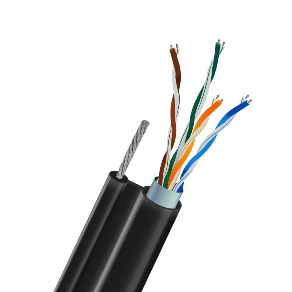 Кабель мережевий вита пара FTP екранований категорії 5e, з багатожильним дротом 7x0.45 мм, для зовнішнього прокладання; для створення мереж 100/1000 Мбіт/сек; 4 пари жил, діаметр 0.5 мм; матеріал провідника мідь; ізоляція провідників поліетилен; зовнішня оболонка LDPE (поліетилен низької щільності) чорного кольору; максимальна частота сигналу 100 мГц; опір кабелю 27-28 Ом; довжина бухти 305 м