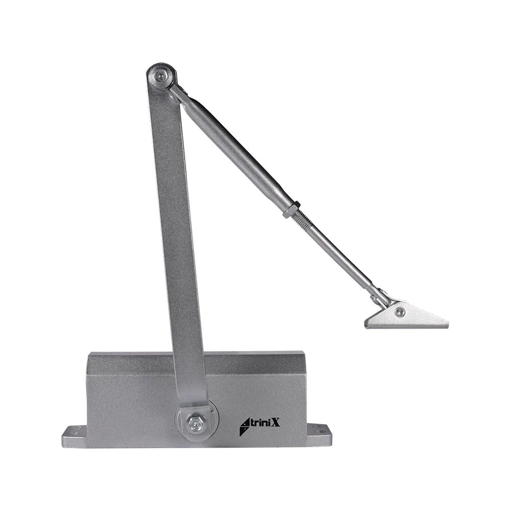 Дверний доводчик; конструкція тяги – складаний важіль; маса дверного полотна 60-85 кг; ширина дверей 1050 мм; регулювання швидкості зачинення (від 180° до 15°) і дохлопу (від 15° до 0°); стійкий до морозу; розміри 207 / 72 / 72 мм; колір срібний