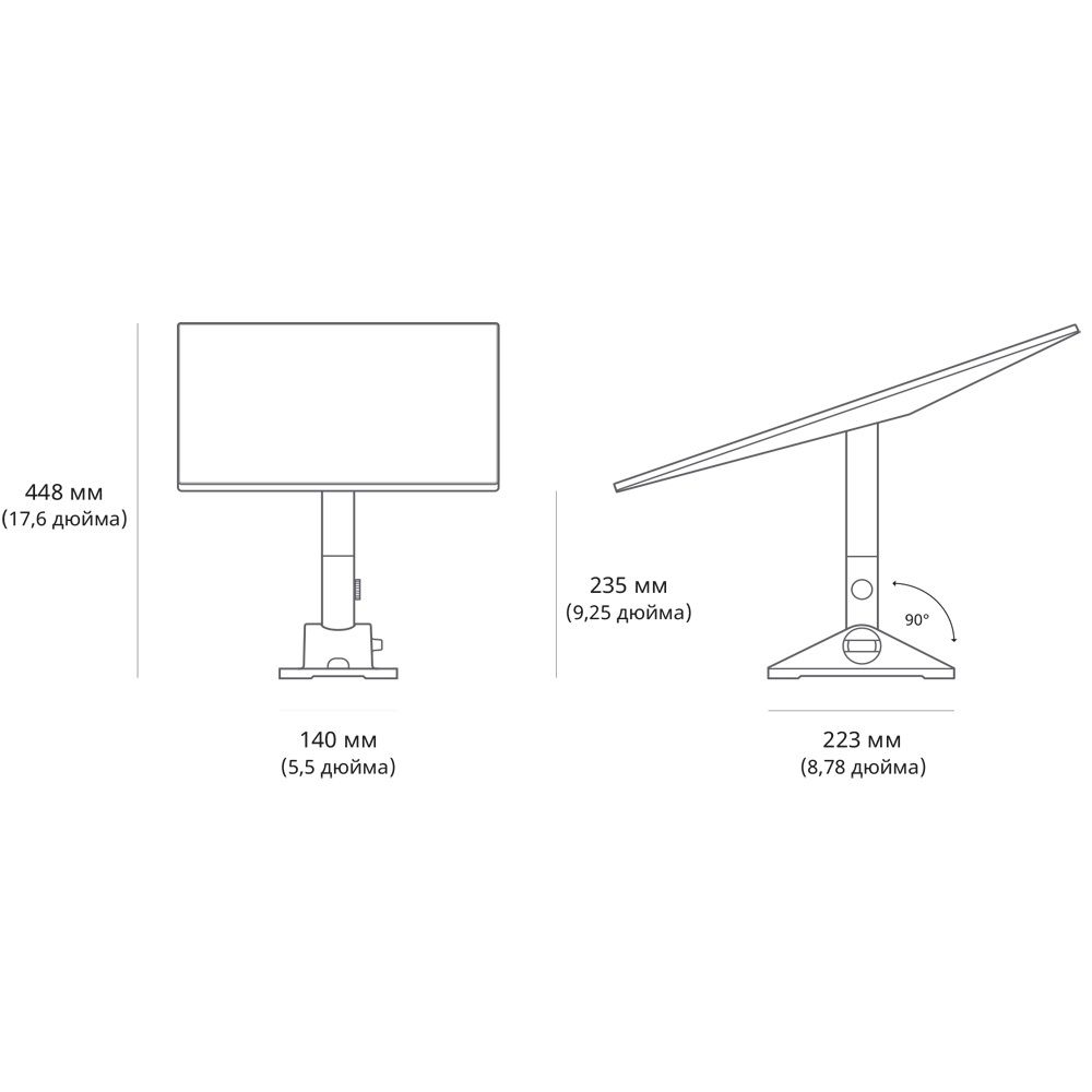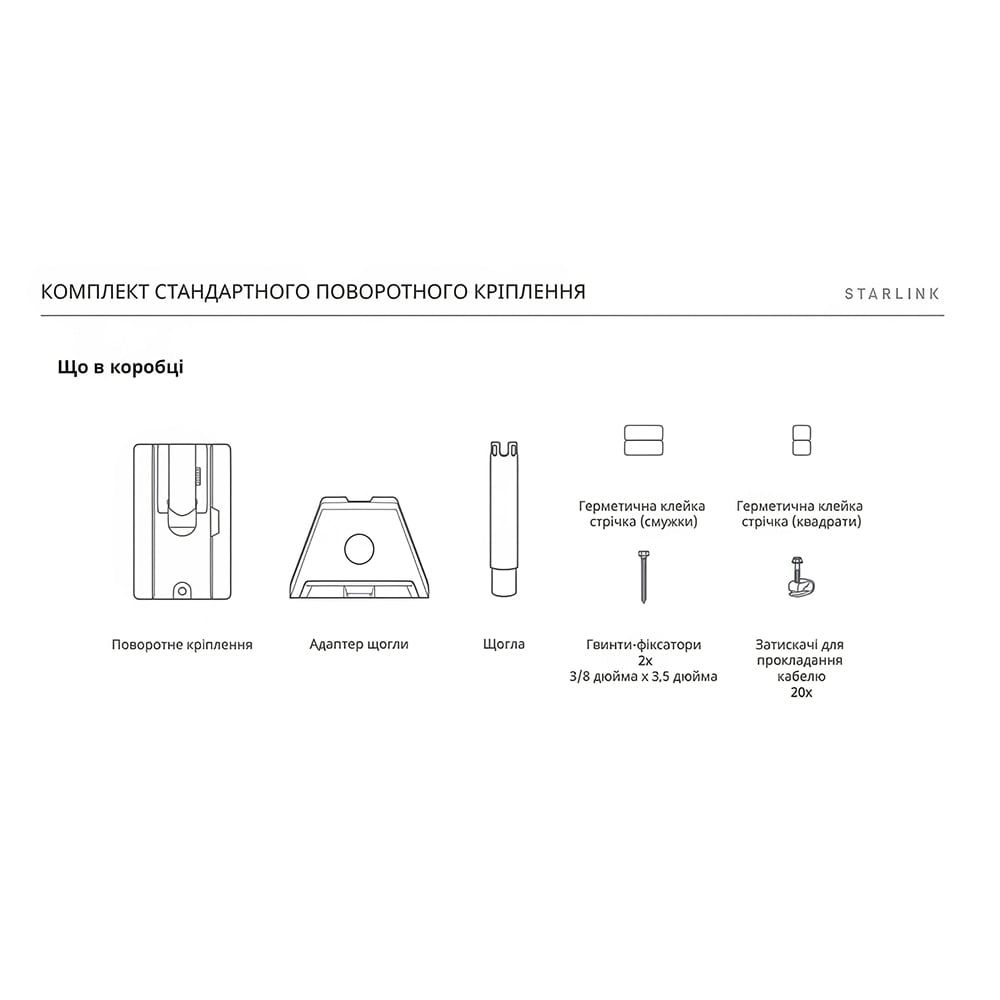 Поворотне кріплення для встановлення термінала Starlink Gen3 REV4 на нахилених дахах; механізм кріплення дозволяє регулювати положення антени для максимально стабільного з'єднання; до комплекту входять щогла з адаптером, герметична клейка стрічка (квадрати та смужки), 2 гвинти-фіксатори, затискачі для прокладання кабелю; розміри 448 / 235 / 140 мм, розміри пакування 280 / 470 / 105 мм; вага пакування 1.9 кг