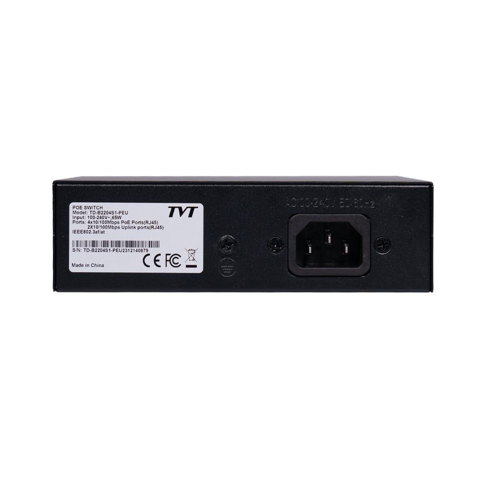 6-портовий PoE-комутатор з 4 портами PoE 10/100Mbps і 2 портами Uplink 10/100Mbps; пропускна здатність: 1.2 Гб/с; стандарт живлення PoE: IEEE802.3at/af, PoE Pin: 1,2 + / 3,6-; максимальна відстань живлення PoE: до 100 м (100 Мбіт/канал), до 250 м (10 Mбіт/канал); порти 1-4 – підтримка режиму дальньої дії до 250 м, VLAN, функції Watchdog; загальна потужність: 60 Вт (до 30 Вт на порт); таблиця MAC-адрес 1K; живлення 100~240V/AC; блискавкозахист: 4KV, захист від електростатичного розряду: 8KV; робоча температура від -20 до +55 °C; розміри: 143 / 115 / 40 мм; вага: 1 кг