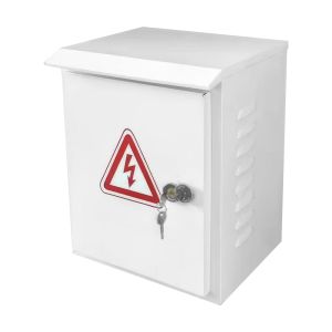 Шафа металева водонепроникна для навісного монтажу; максимальне навантаження: на шафу 7 кг, на 1 поличку 3 кг; дві знімні полички; замок із ключами; напрямна рейка та ізоляційна монтажна панель; кабельні введення; метал товщиною 1 мм; розміри 372 / 300 / 250 мм (270 мм з козирком)