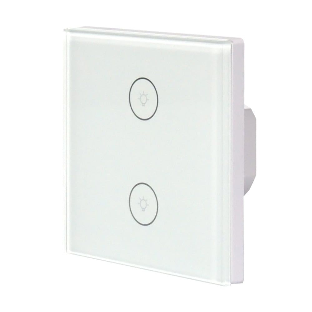 Розумний вимикач світла подвійний сенсорний з підтримкою WiFi 2.4 ГГц (IEEE 802.11b/g/n) та можливістю керування і налаштування через мобільний застосунок Tuya; дальність зв’язку 30 м; номінальна напруга AC 100-240 В, 50/60 Гц; максимальне навантаження на кожен вихід 800 Вт; номінальний струм 10 А; струм споживання у режимі очікування 0.1 мА; голосове керування через Google Assistant / Amazon Alexa; підсвічування кнопок керування; матеріал вогнестійкий пластик; розміри 85 / 85 / 35 мм