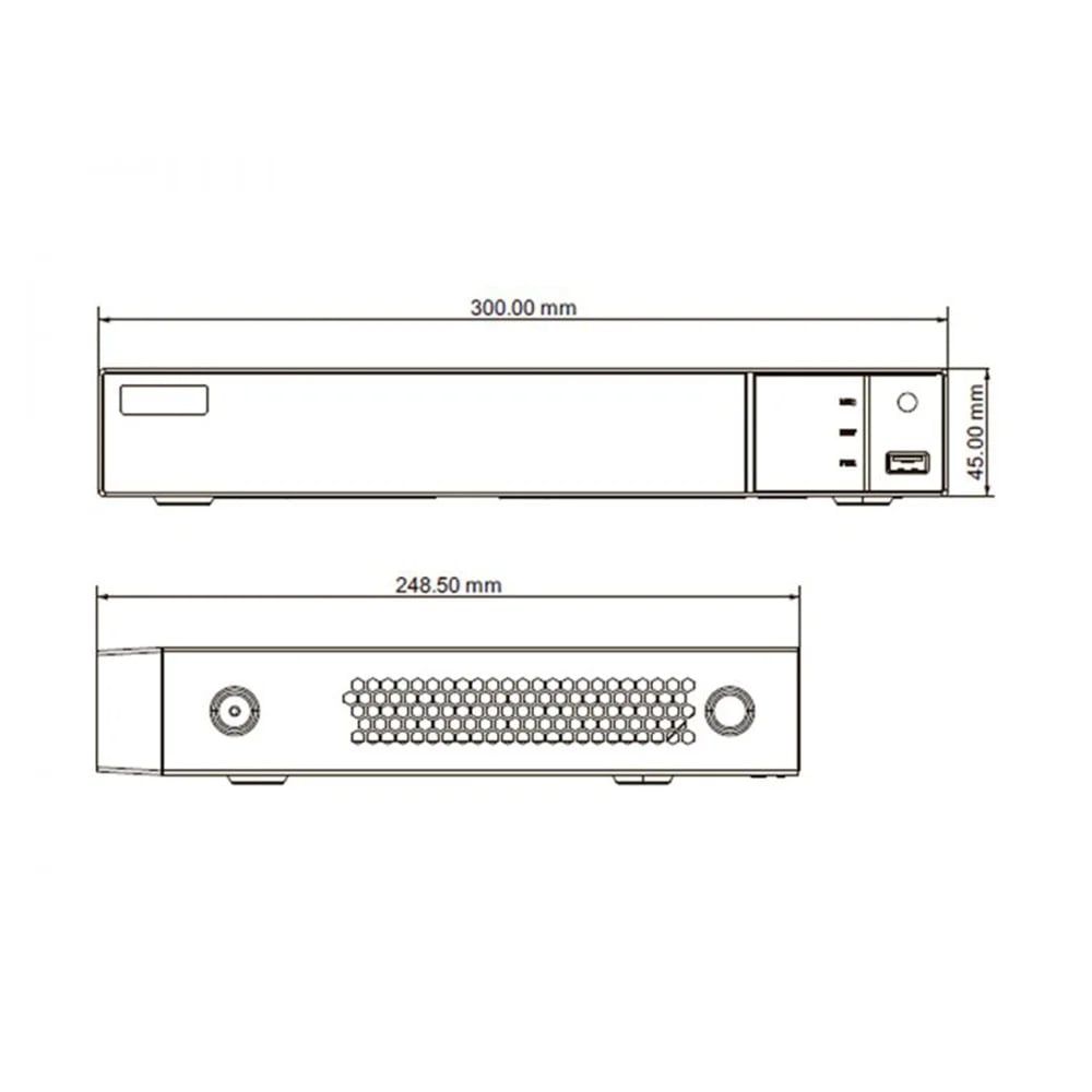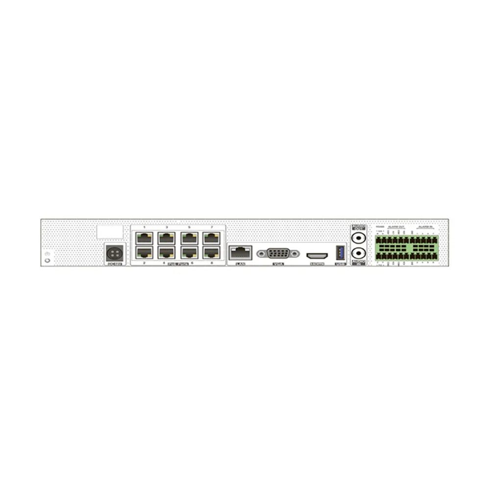 8-канальний мережевий відеореєстратор з підтримкою розпізнавання облич та вимірювання температури; роздільна здатність 8MP / 6MP / 5MP / 4MP / 3MP / 1080P в форматі H265+, H.265, H.264; вхідний / вихідний потоки 80Mbps / 80Mbps; аудіо: вхід: RCA x 1, вихід: RCA x 1, підтримка роботи з iOS, Android пристроями; база даних облич: 4 групи, 20000 фото; запис обличчя: роздільна здатність: 128 x 128 ~ 1920 x 1080; відеовихід: HDMI x 1 3840 x 2160, VGA x 1 1920 x 1080; тривожні: вхід: 8 вихід: 4; перегляд архіву камер: локально / через мережу 8/8; мережа: RJ45 1000 Mbps; інтерфейси: USB 2.0 x 1, USB 3.0 x 1, RS485, HDD: SATA x 1, 10Tb; живлення: DC12V / 2A; розміри 300 / 249 / 45 мм