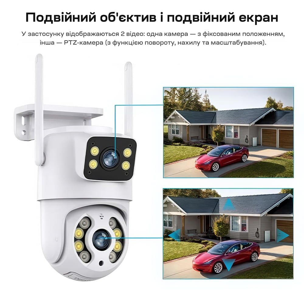 3Mp+3Mp вулична поворотна IP-відеокамера з підтримкою Wi-Fi (2.4 ГГц), з подвійним об’єктивом і подвійним підсвічуванням; об’єктив 3.6 мм + 3.6 мм; матриця 1/2.8″ CMOS x2; роздільна здатність запису 2048*1536 x2; кут повороту 0-355°, кут нахилу 0-90°; ІЧ-підсвічування до 20 м + LED-підсвічування до 20 м; віддалений моніторинг на смартфонах (застосунок Tuya); детекція руху, виявлення людини, автотрекінг; вбудований мікрофон та розмовний динамік; запис за детекцією на карту microSD (до 128 ГБ) або у хмару; живлення 5 В/1.5 А через інтерфейс USB Type-C; робоча температура -20°C~+55°C; клас захисту IP66; габаритні розміри 145 / 102 мм