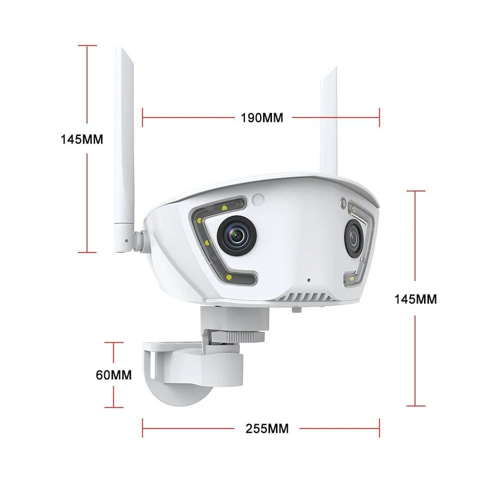 2Mp+2Mp вулична панорамна IP-відеокамера з підтримкою Wi-Fi (2.4 ГГц) та Ethernet; роздільна здатність запису 3840*1080 пікселів; відеокодек Smart H.264; подвійна оптика з об’єктивами f=3.6 мм та горизонтальним кутом огляду 155°; матриця 1/2.9" CMOS; нічне бачення: повноколірне LED до 20 м, інфрачервоне до 30 м та «розумне»; вбудований мікрофон та розмовний динамік; віддалений моніторинг на смартфонах iOS та Android (застосунок CamHipro); порт Ethernet RJ45 10/100M; детекція руху та виявлення людини; запис на карту microSD (до 128 ГБ) або у хмару; живлення DC 12 В; ступінь захисту IP66; габаритні розміри 255 / 190 мм, антени 145 мм