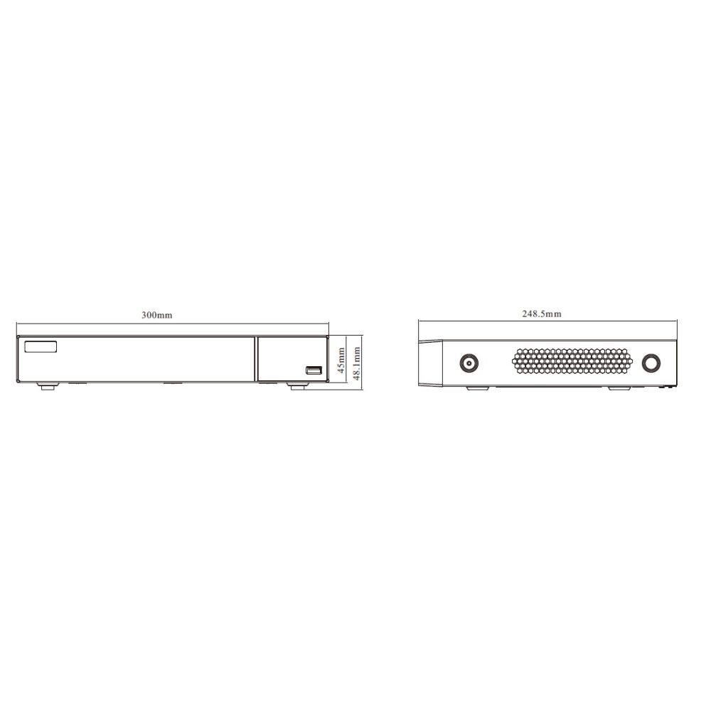 8-канальний мережевий відеореєстратор з підтримкою інтелектуальної відеоаналітики, з максимальною роздільною здатністю 16MP; відеокодек H.265+, H.265S, H.265, H.264; запис: 16MP / 12MP / 8MP / 6MP / 5MP / 4MP / 3MP / 1080P / 960P / 720P @ 25fps; вхідний/вихідний потоки 192Mbps/192Mbps; відеовихід: HDMI (4K), VGA (Full HD); аудіо: вхід RCA x1 / вихід RCA x1; тривожні: входи 8/виходи 4; база даних облич: 32 бібліотеки/10000 фото облич, порівняння облич: 18 зображень/сек; перегляд архіву камер: локально/мережею 8/8; мережа: RJ45 1000Mbps x2, USB 2.0 x2, USB 3.0 x1, HDD: SATA x1 до 10 ТБ; живлення DC 12V/2А; розміри 300 / 248.5 / 48.1 мм