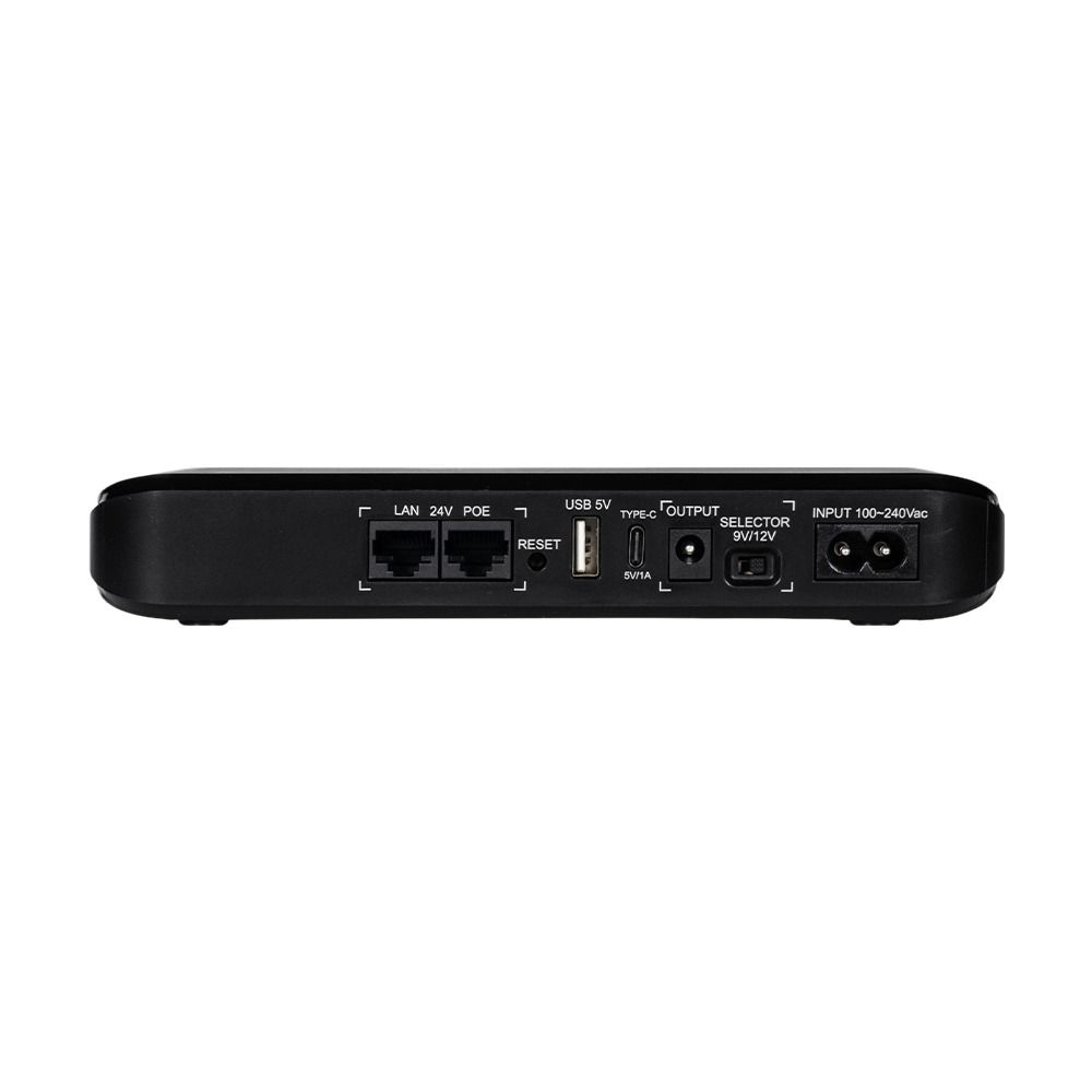 АКБ: 20000 мА·год (4 x 5000 мА·год LiFePO4 26700). Вихідні інтерфейси USB, Type-C, DC, PoE: USB: 5В/2А, Type-C: 5В/1А, DC: 9В/2А або 12В/1.5А, PoE: 24В/0.7А. Максимальна вихідна потужність: 18 Вт. Захист від короткого замикання, перевантаження, перерозряду / перезаряду. Індикатор рівня заряду та статусу. Живлення AC 100-240 В. Пластиковий корпус. Розміри: 206 x 120 x 35 мм, вага 640 г