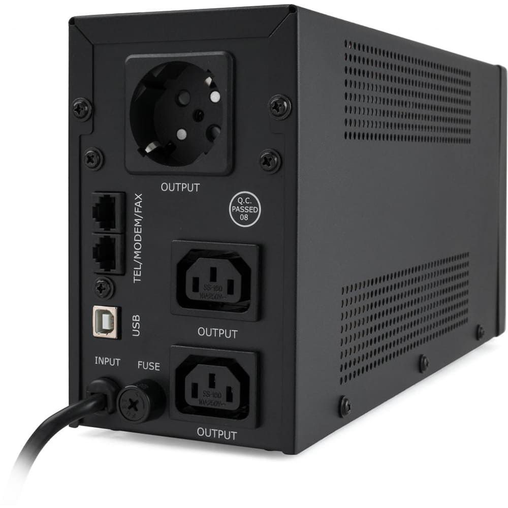 ДБЖ лінійно-інтерактивне з апроксимованою синусоїдою. Потужність 650ВА / 360 Вт. Вхідна напруга 162-295 В. Вбудована АКБ: 12В / 7Агод. 2 євророзетки, 1 IEC, USB. Металевий корпус. Розміри 95 x 320 x 160 мм