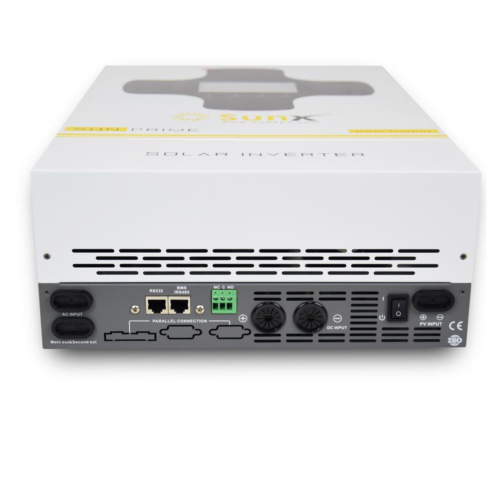 Інвертор SunX PSW WH 4.2KW; Номінальна потужність: 4200 ВА / 4200 Вт; PV/DC/AC: 4500 ВА / 4500 Вт; Коефіцієнт потужності: 1.0; Діапазон робочої температури: від -10 до +50 °C; Режим інвертора; Вхід постійного струму: 24 В DC, 165 А; Вихід змінного струму: 230 В AC, 50/60 Гц, 18,3 А; Режим сонячного зарядного пристрою; Номінальний струм MPPT: 120 А; Номінальна потужність сонячних панелей: 6500 Вт; Максимальний струм сонячного входу: 27 А; Оптимальний діапазон напруги PV: 300–400 В DC; Максимальна сонячна напруга (VOC): 500 В DC; Діапазон напруги MPPT: 60–500 В DC; Два виходи навантаження; Повне навантаження: 4200 Вт; Максимальне основне навантаження: 4200 Вт; Максимальне друге навантаження: 4200 Вт; Напруга відключення другого навантаження: 22 В DC; Напруга повернення другого навантаження: 26 В DC; Габарити: 592×392×185 мм