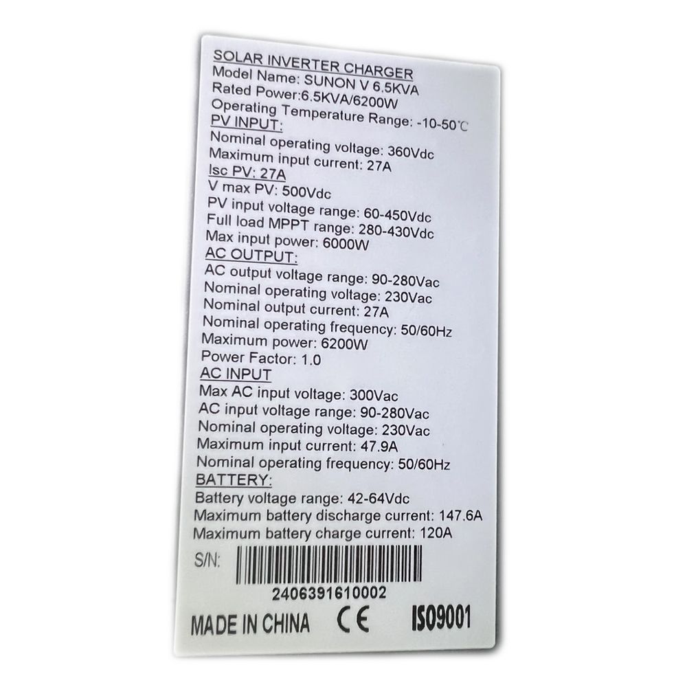 Гібридний однофазний інвертор; максимальна потужність 6.5 кВА/6.2 кВт, максимальна короткочасна потужність 12.4 кВА; правильна синусоїда на виході 220В; вбудований MPPT-контролер і мережевий зарядний пристрій; максимальний струм заряду 120А; вхідна напруга 90-280В; діапазон напруги від сонячних панелей 60-450В, макс. потужність 6000 Вт; ККД 93%; вихідна напруга 230В ±5%; вихідна частота 50/60 Гц; напруга акумуляторної системи 48В; час перемикання на АКБ 10 мс; підтримка заряду АКБ типу AGM/GEL/LiFePo4/Li-ion; вбудований локальний Wi-Fi - тільки для моніторингу з мобільного додатка; LCD-дисплей; функція «холодного» пуску; режим підмішування; захист від перевантаження, короткого замикання, перегріву; робоча температура -10°C~+50°C; розміри 583x380x214 мм, вага 10. 4 кг