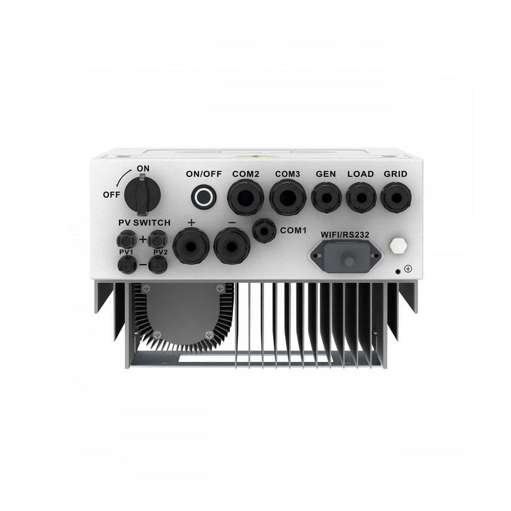 Гібридний однофазний інвертор. Номінальна потужність: 6000 Вт. Діапазон напруги батареї: 40-60 В. Макс. струм заряду акумулятора: 135 А. Макс. вхідна потужність PV: 9600 Вт. Номінальна вхідна напруга PV: 370 В. Кількість трекерів МРРТ: 2. Форма вихідного сигналу: чиста синусоїда. Підключення генератора. Можливість роботи без підключення АКБ. Заряджання АКБ за розкладом. Інтерфейси управління RS485 / RS232 / CAN / Wi-Fi . Можливість паралельного підключення: 16 пристроїв. Активне охолодження (вентилятори). Клас захисту: IP65. Розміри: 330×580×232 мм. Вага: 24.9 кг.