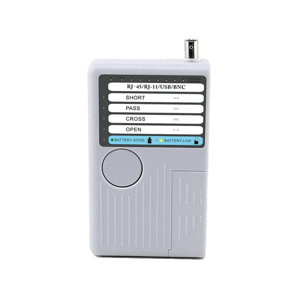 Багатофункціональний тестер NF-3468 призначений для перевірки кабелів RJ45, RJ11, BNC та USB. Пристрій виявляє обриви, короткі замикання, перехресні пари і правильність з'єднання. Підтримує довжину тестованої лінії до 450 м, оснащений світлодіодною індикацією і модулем для віддаленого тестування. Працює від батареї 9 В, відповідає стандартам RoHS, FCC і CE.