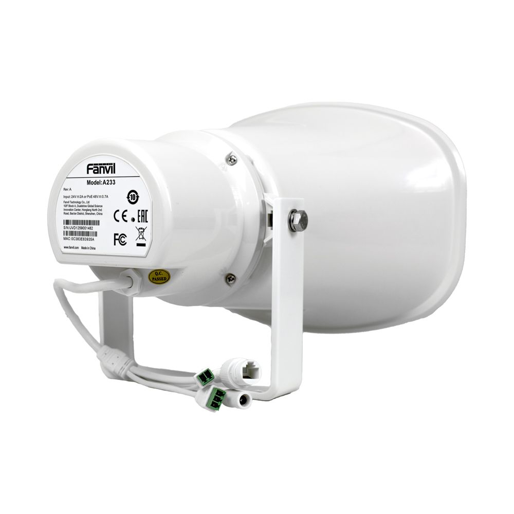 Fanvil A233 — рупорний SIP-динамік для систем оповіщення та гучного зв’язку на промислових і вуличних об’єктах. Пристрій оснащений динаміком потужністю до 30 Вт і вбудованим всеспрямованим мікрофоном для двостороннього зв’язку. Підтримує HD-аудіо з кодеками G.722 та Opus, багатоадресну трансляцію до 20 зон і зберігання аудіофайлів у вбудованій пам’яті 24 МБ. Працює за SIP-протоколом і може інтегруватися із системами відеоспостереження, контролю доступу та безпеки. Живлення здійснюється через PoE+ (IEEE 802.3at) або зовнішнє джерело DC 24 В / 2 А. Корпус має ступінь захисту IP66 і підходить для експлуатації на відкритому повітрі.