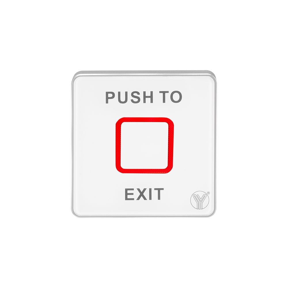 Кнопка виходу сенсорна контактна, накладна, NO/NC/COM, корпус покритий загартованим склом, діодна індикація стану кнопки виходу, DC12-24V, струм споживання: 60mA, очікування - червоний, спрацювання - зелений, 86 х 86 х 12 мм.