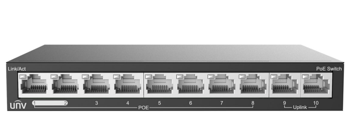10 портів RJ45 10/100 Мбіт/с, з яких 8 портів підтримують PoE+ (IEEE 802.3af/at).