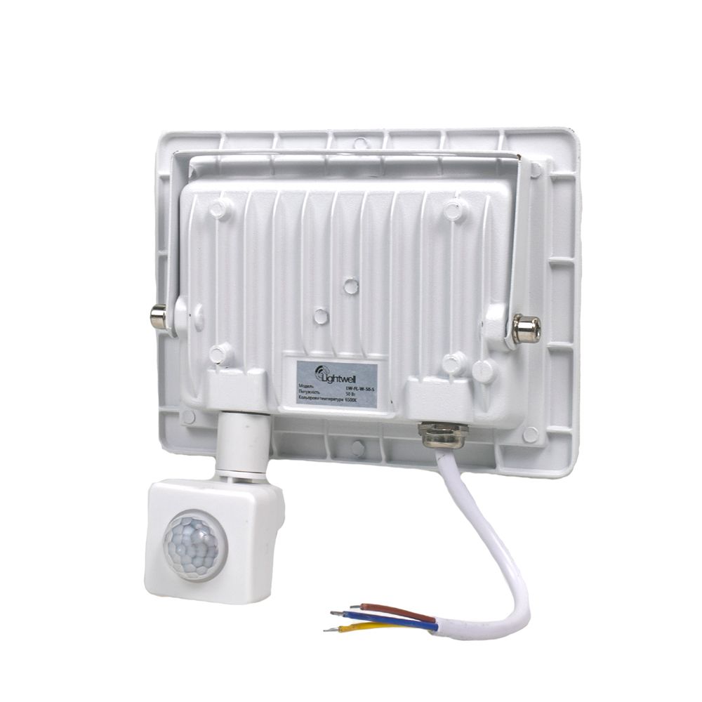 Датчик руху. Потужність: 50 Вт. Колірна температура: 6500К. Індекс передавання кольору (CRI) ≥ 70. Світловий потік: 70-80 лм/Вт. Кут світлового потоку: 120°. Джерело живлення: від мережі 220 В. Захист від перенапруги: 1500 В. Термін служби: 50000 год. Матеріал корпусу: алюміній. Розсіювач: загартоване скло. Клас захисту: IP65. Спосіб монтажу: кронштейн.