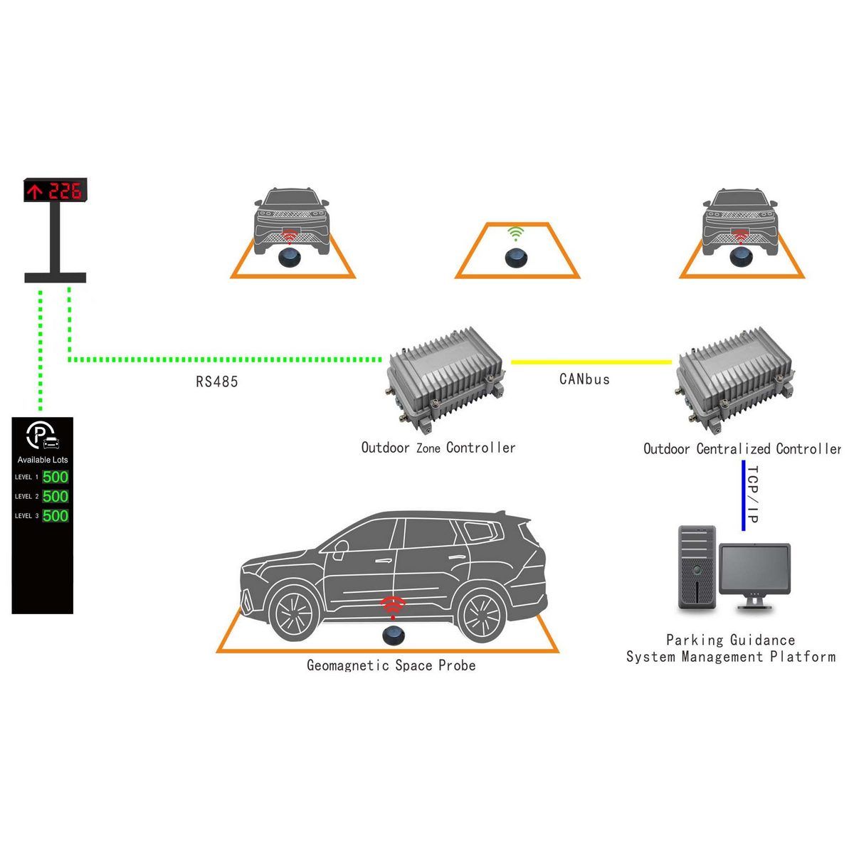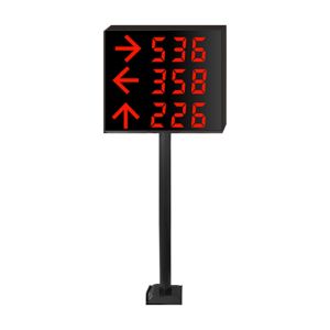 Зовнішнє навігаційне табло. Інформація про 3 напрямки руху. Відображувана інформація: цифри, стрілки (8 напрямків). Інтерфейс зв'язку: RS-485. Дистанція зв'язку: до 300 м. Живлення: AC 110~240 В. Споживана потужність: до 15 Вт. Матеріал корпусу: алюмінієвий сплав. Ступінь захисту: IP65. Робоча температура: -40~+85°C. Виконання: зовнішнє. Розмір: 690×530×65. Висота стійки: 1200 мм