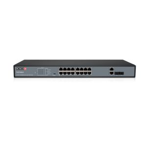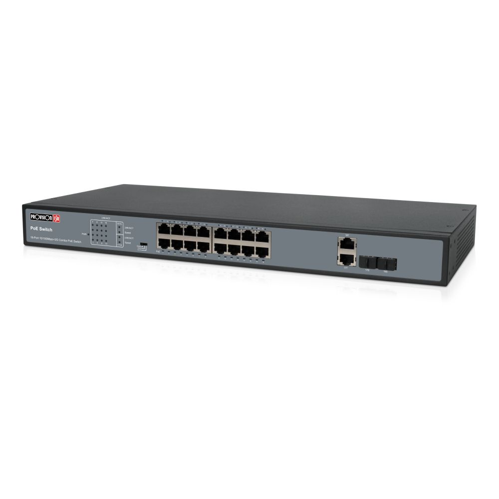 18: 16x10/100 Base-T (PoE), 2x10/100/1000 Base-T (Uplink); 2x1000 Base-X (SFP) – Combo ports