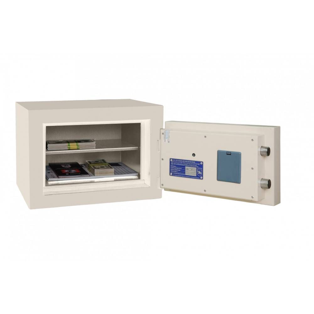 Сейф меблевий, вогнестійкий, електронний кодовий замок, для кріплення на підлогу та стіну, товщина захисного шару 43 мм, 1 поличка, зовнішні розміри: 298 х 420 х 362 мм, внутрішні розміри: 196 х 334 х 220 мм. Вага: 39 кг.