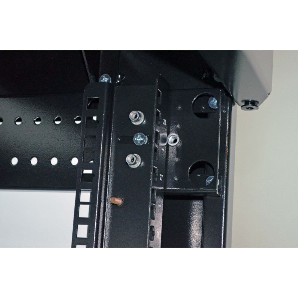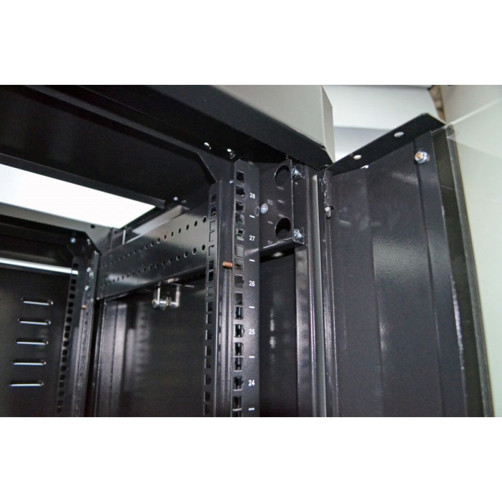 Серверна шафа посилена для розміщення електронного та/або електротехнічного обладнання. Робоча висота: 28U. Товщина металу деталей корпусу: 1 - 2 мм. Максимальне навантаження: 450 кг. Стандарт: 19". Максимальна робоча глибина для встановлення обладнання: 675 мм. Колір чорний.