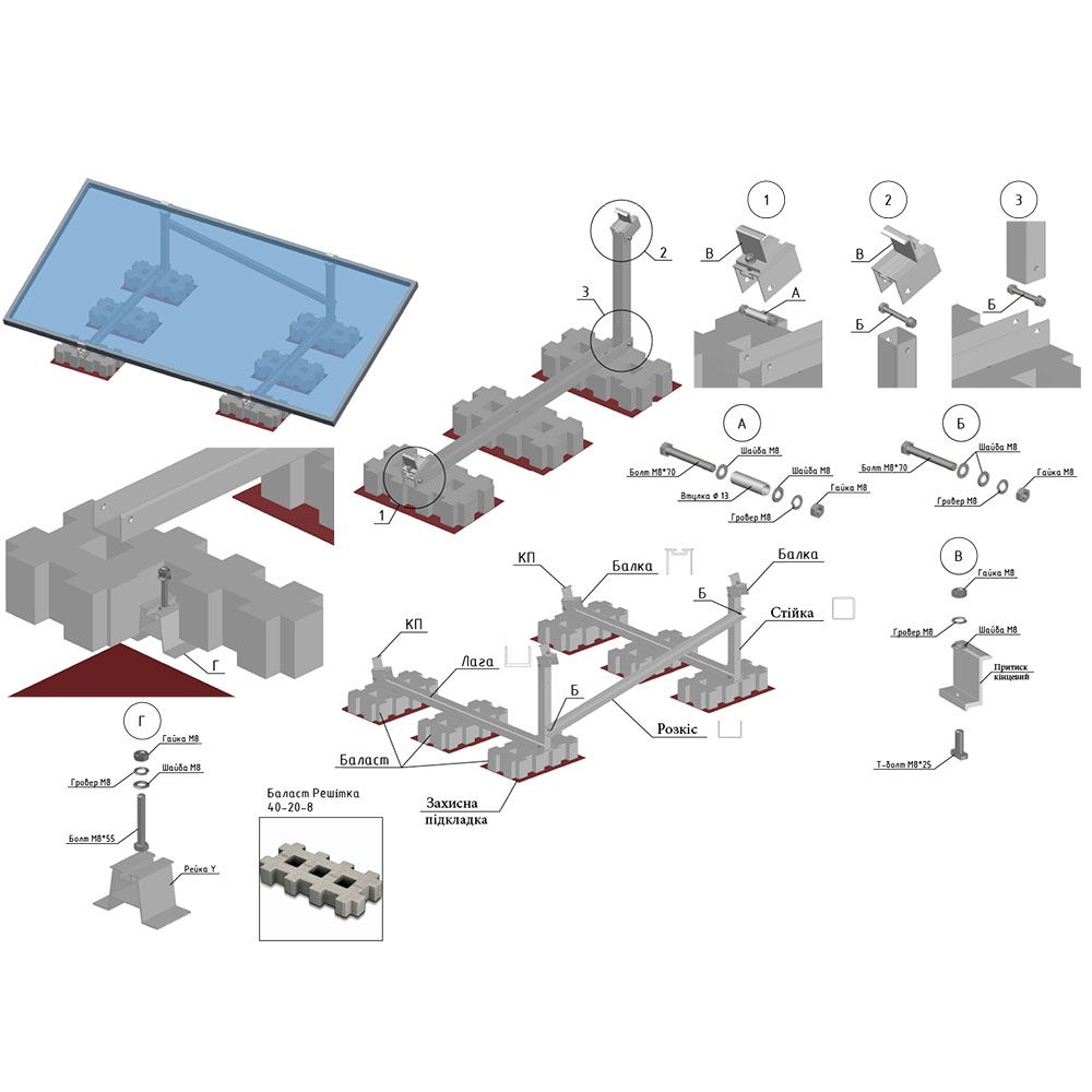 Баластова система дає змогу розмістити фотоелектричні модулі на дахах промислових, комерційних і приватних будівель, і забезпечує необхідний кут нахилу панелей для максимальної генерації. Матеріал: Анодований алюмінієвий профіль. Сплав: АД31 (6063) Т5. Антикорозійне покриття: АН15 (15 мікрон). Метиз: нержавіюча сталь А2. Під час проєктування проведено розрахунок максимальних вітрових/снігових навантажень. При правильному встановленні витримує максимальне значення вітрових/снігових навантажень у будь-якому регіоні України.