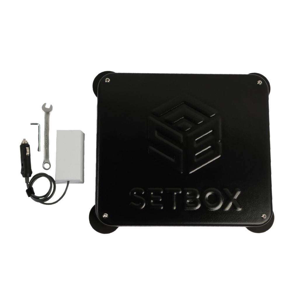 Комплект Starlink Mini + живлення 12В являє собою адаптований термінал Starlink Mini, встановлений в корпус Setbox, і живлення 12В для підключення до прикурювача автомобіля. Розмір корпусу становить 350×310×50 мм, вага комплекту — близько 2 кг. Швидкість з'єднання — до 150 Мбіт/с. Живлення підтримується в режимах 220В, 24В, 12В і Type-C. Середнє енергоспоживання — 25–40 Вт. Для установки використовуються магнітні шарніри із захисним покриттям.