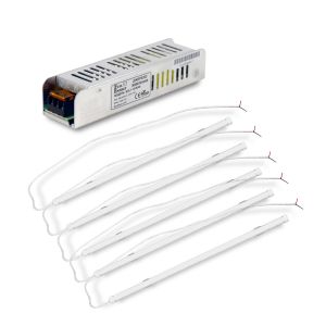 Комплект із 5-ти світильників + блок живлення. Світильник LED лінійний для стаціонарного та резервного освітлення. Потужність лампи: 10 Вт. Світлова температура 6500K (білий холодний). Живлення: 12В. Розміри: 450 х 50 х 50 мм. Блок живлення (перетворювач) для LED стрічки, одноканальний, вихід: 12 В/10 А, клемник; вхід: AC 176 – 264 В, клемник; потужність 120 Вт; металевий корпус. Розміри 188 x 47 x 32 мм.