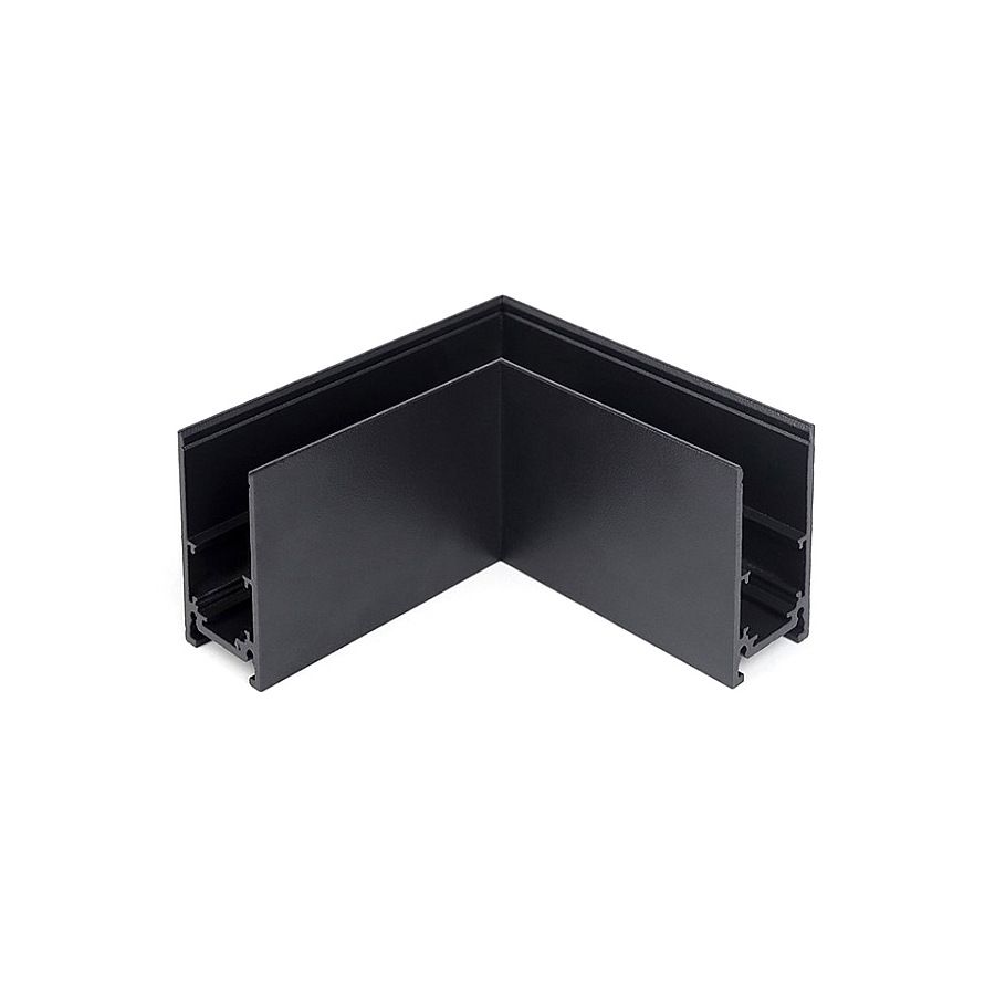 З'єднувач кутовий горизонтальний L-подібний для підвісних та накладних магнітних треків. Розмір профілю (Ш × В): 26.8 × 51 мм. Матеріал: алюмінієвий сплав. Колір: чорний