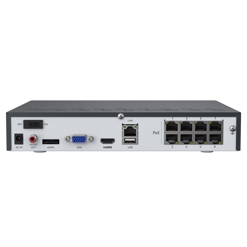 Кількість каналів: 8; Стиснення: H.265, H.264; Макс. роздільна здатність запису: 12 Мп; Відеовиходи: HDMI, VGA; Аудіовихід: RCA; Зберігання даних: 1 слот для SATA HDD до 6 ТБ, 1 eSATA порт для HDD до 6 ТБ (макс. загальна ємність зберігання 12 ТБ), в комплекті 1 x 2 ТБ SATA HDD; Інтерфейси: 8 x RJ-45 10/100M із підтримкою PoE для IP-камер, 1 x RJ-45 10/100/1000M LAN/WAN; 2 x USB 2.0; Живлення: DC 48-53 В / 10 Вт (без HDD & PoE); Розміри 260 x 41 x 230 мм