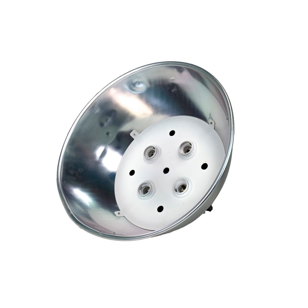 Промисловий підвісний світильник НСП-Е27-4 на 4 патрони E27 для освітлення складів, цехів, ангарів та інших великих приміщень. Має міцний алюмінієвий корпус, кріплення на гак та ступінь захисту IP54. Підходить для ламп розжарювання, енергозберігаючих і LED.